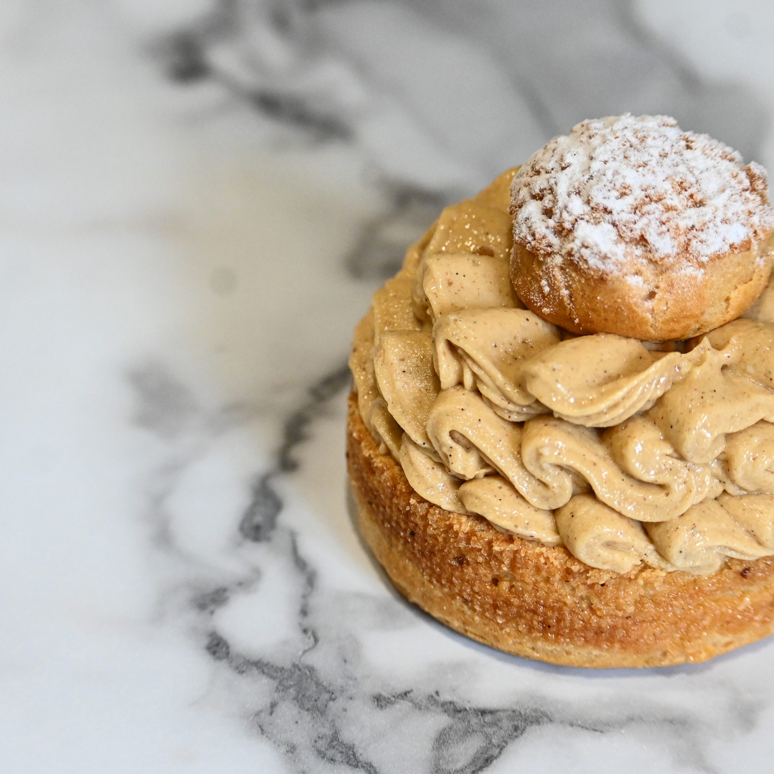 Choux Craquant / Croustillant Sablé Noisettes / Mousseline Praliné Noisettes / Cœur Coulant Praliné Noisettes.